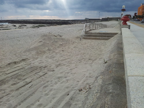 Além disso, da maneira como a praia está neste momento, com a areia, em vários pontos, quase ao nível da avenida marginal, corre-se o risco de num dia de temporal, com mar de sudoeste, este galgue o paredão, invada a via pública e o casario, provocando danos de vulto. Calculo que o nível da praia neste local tenha subido em média entre 1,5 m e 2 metros.